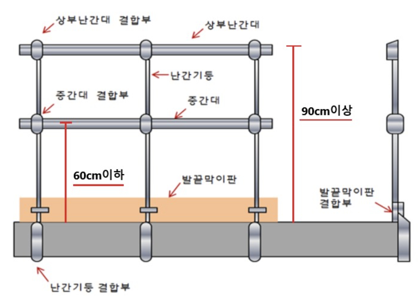 5. 안전난간은 구조적으로 가장 취약한 지점에서 가장 취약한 방향으로 작용하는 100kg 이상의 하중에 견딜 수 있는 튼튼한 구조이어야 한다.